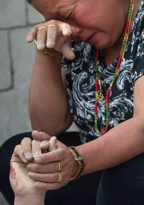 Зане дасти яке аз пайвандони фавтидаашро дар бемористони Катманду дар даст дорад.