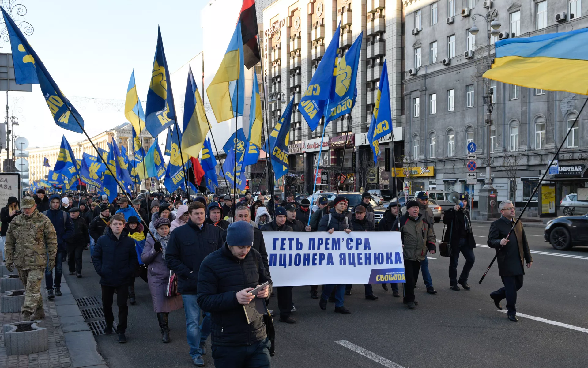 ДУШАНБЕ, 11 дек — Sputnik. Издиҳоми иборат аз чандсад нафар ҳаракати нақлиёт дар яке аз ҷоддаҳои марказии Киев, кӯчаи Грушевскийро масдуд карда, ҳоло дар назди бинои Радаи боло ҷамъ шуда, талаби истеъфои девони вазирони Украинаро доранд.