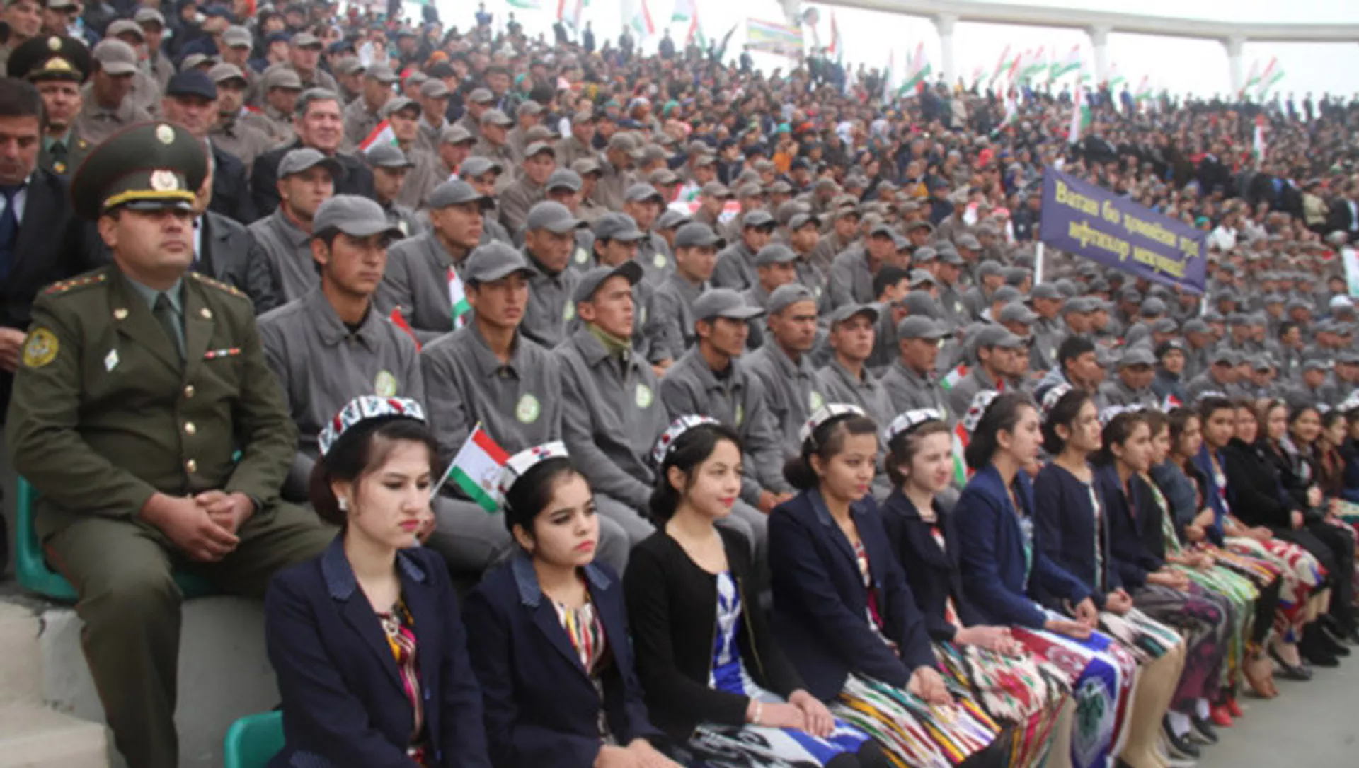 Ҷавонон бо шиорҳои дар даст буда гӯё қавл медиҳанд, ки барои ҳифзи Ватан ҷонашонро дареғ намедоранд.