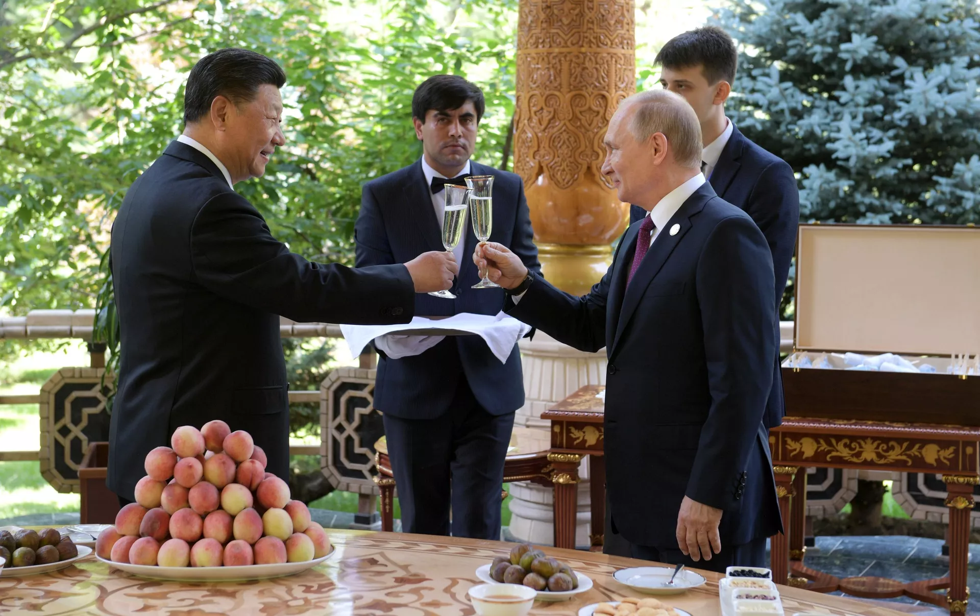 ДУШАНБЕ, 15 июн — Sputnik. Президенти Русия Владимир Путин имрӯз дар Душанбе то оғози расмии нишасти бузург роҳбари ҷумҳурии мардумии Чин Си Ҷинпинро бо зодрӯзаш шодбош гуфт ва ба ӯ яхмоси истеҳсоли Русия тӯҳфа кард, ки ба роҳбари Чин хело писанд омадааст.