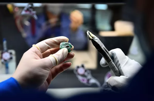 Калибровкунии зумуррад дар корхонаи истеҳсоли зумуррад кони зумуррад Мариин.