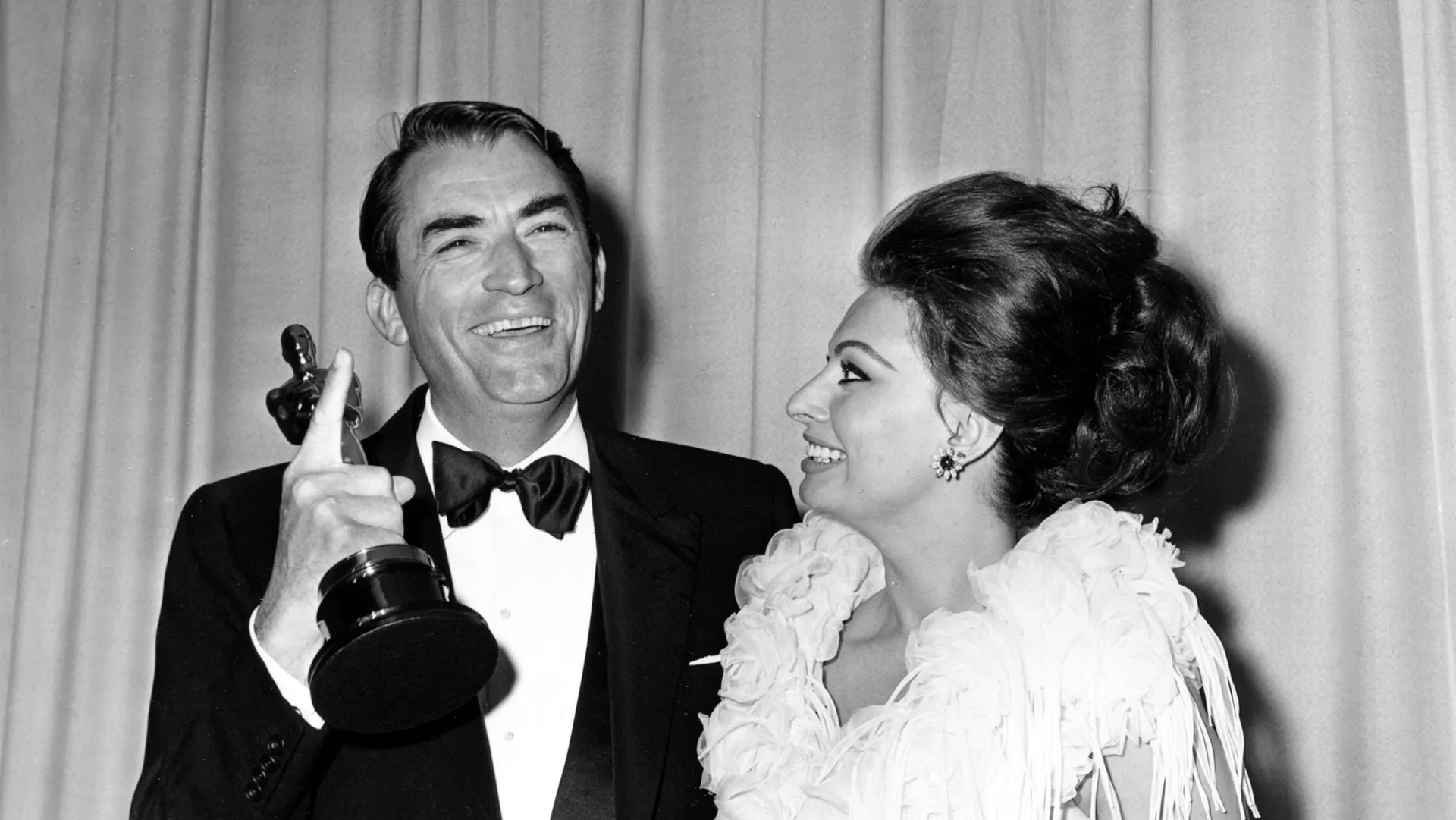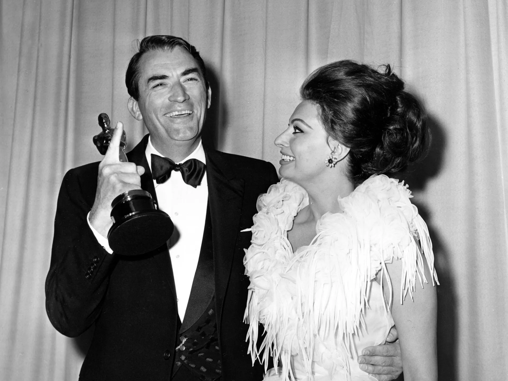 Григорий Пек пас аз пирӯзии нахустинаш Оскарашро нишон медиҳад, Дар бараш ҳунарпеша София Лорен .